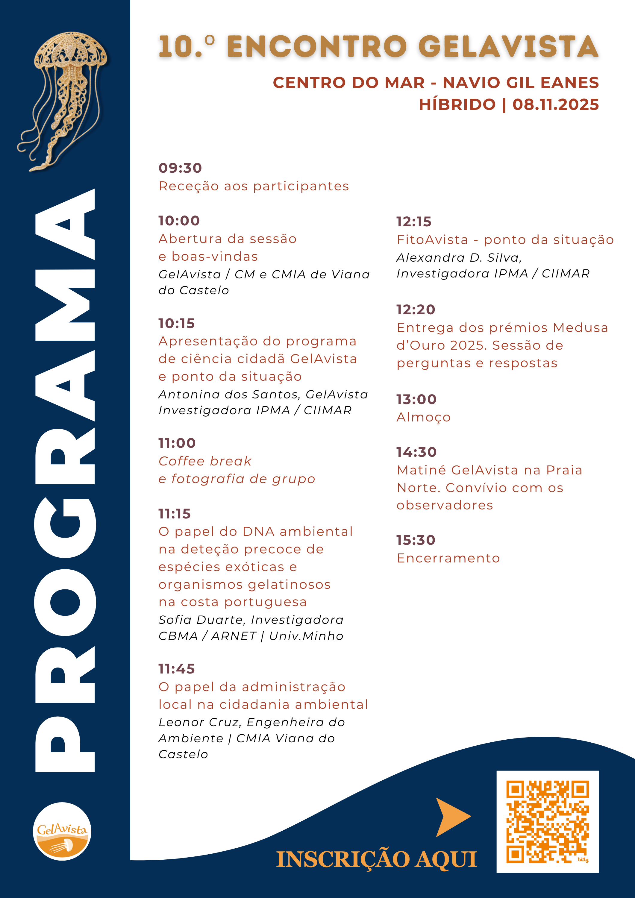 OUTROS EVENTOS | Realiza-se, no dia 08 de novembro de 2025, o 10.º Encontro GelAvista no Centro de Mar de Viana do Castelo. Esta iniciativa procura divulgar o programa que monitoriza, desde 2016, os organismos gelatinosos em toda a costa de Portugal continental, Açores e Madeira, com a ajuda dos cidadãos. Esta iniciativa integra a XI Semana do Mar.