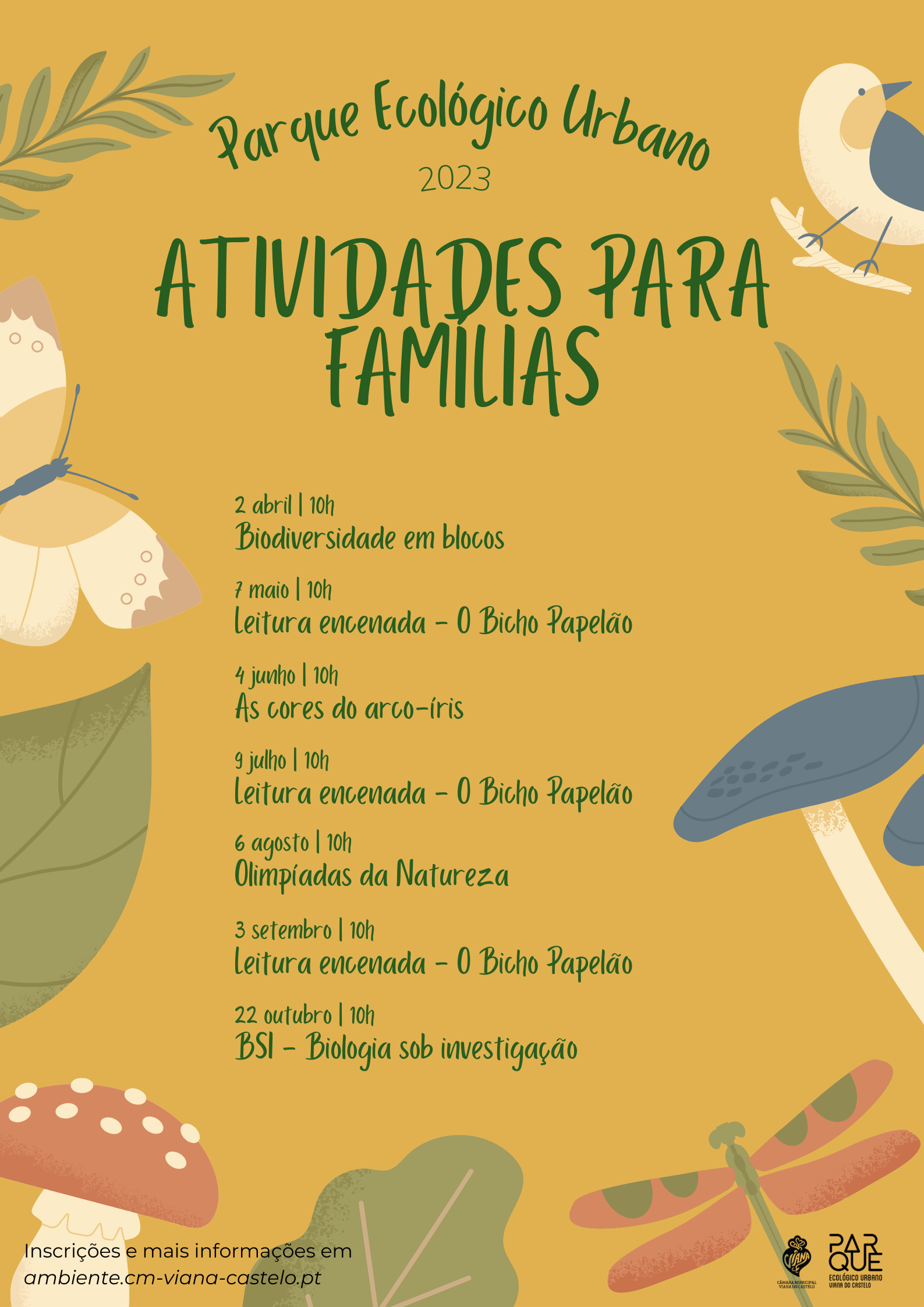 WORKSHOP PARA FAMÍLIAS / O Parque Ecológico de Viana do Castelo, ao longo do ano 2023, proporcionará atividades mensais, direcionadas ao público em geral e famílias, com temáticas relacionadas com o ambiente e biodiversidade.