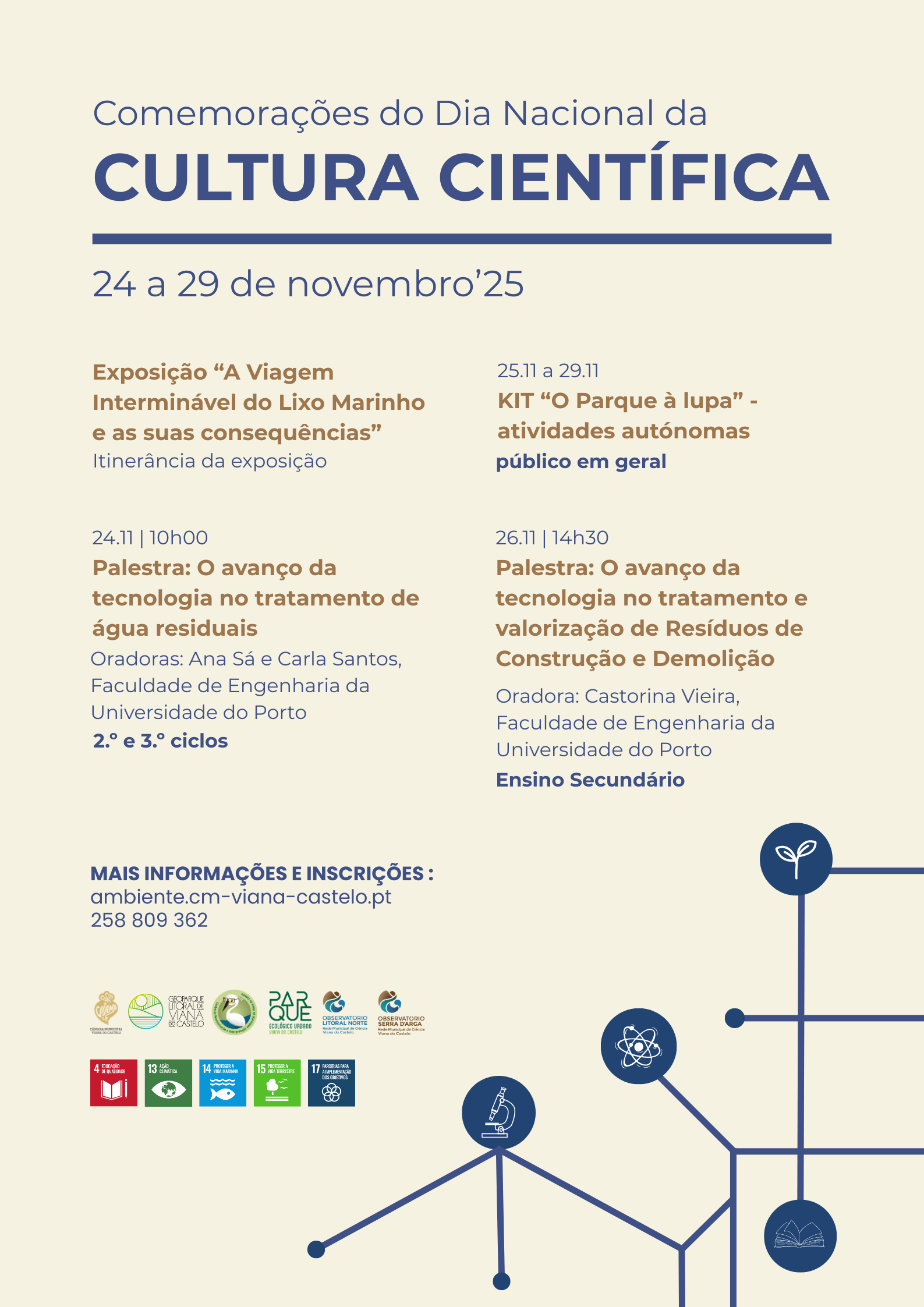 DIA TEMÁTICO | No âmbito da comemoração do Dia Nacional da Cultura Científica, celebrado no dia 24 de novembro, o Centro de Monitorização e Interpretação Ambiental (CMIA) de Viana do Castelo promove, entre os dias 24 e 30 de novembro de 2025, um conjunto de atividades dedicadas à divulgação da ciência e à promoção da literacia ambiental.