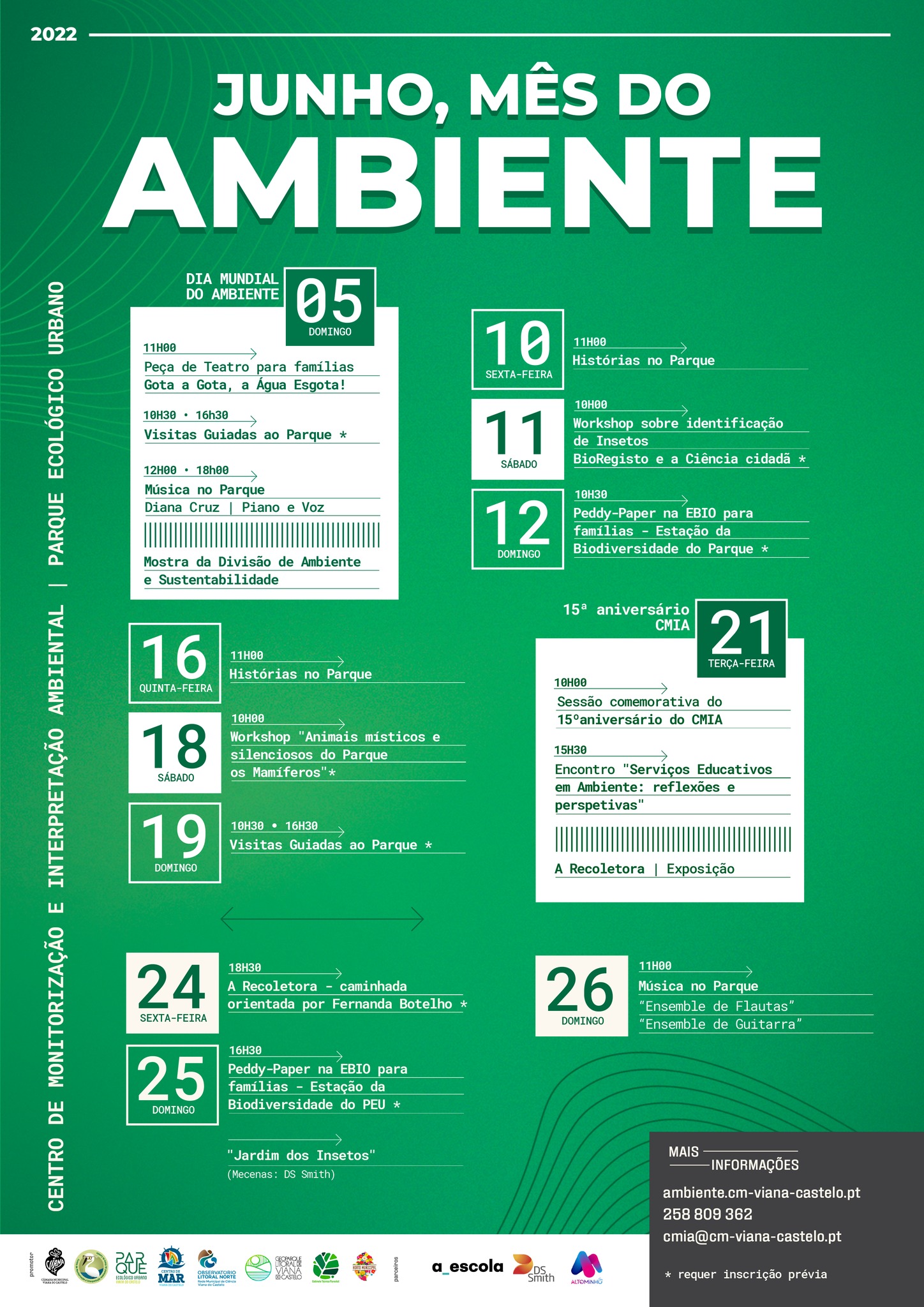 DIA TEMÁTICO / Durante o mês de junho de 2022, o Centro de Monitorização e Interpretação Ambiental (CMIA) e o Parque Ecológico Urbano (PEU), irão proporcionar diversas atividades para comemorar o Dia Mundial do Ambiente e o 15º aniversário do CMIA.