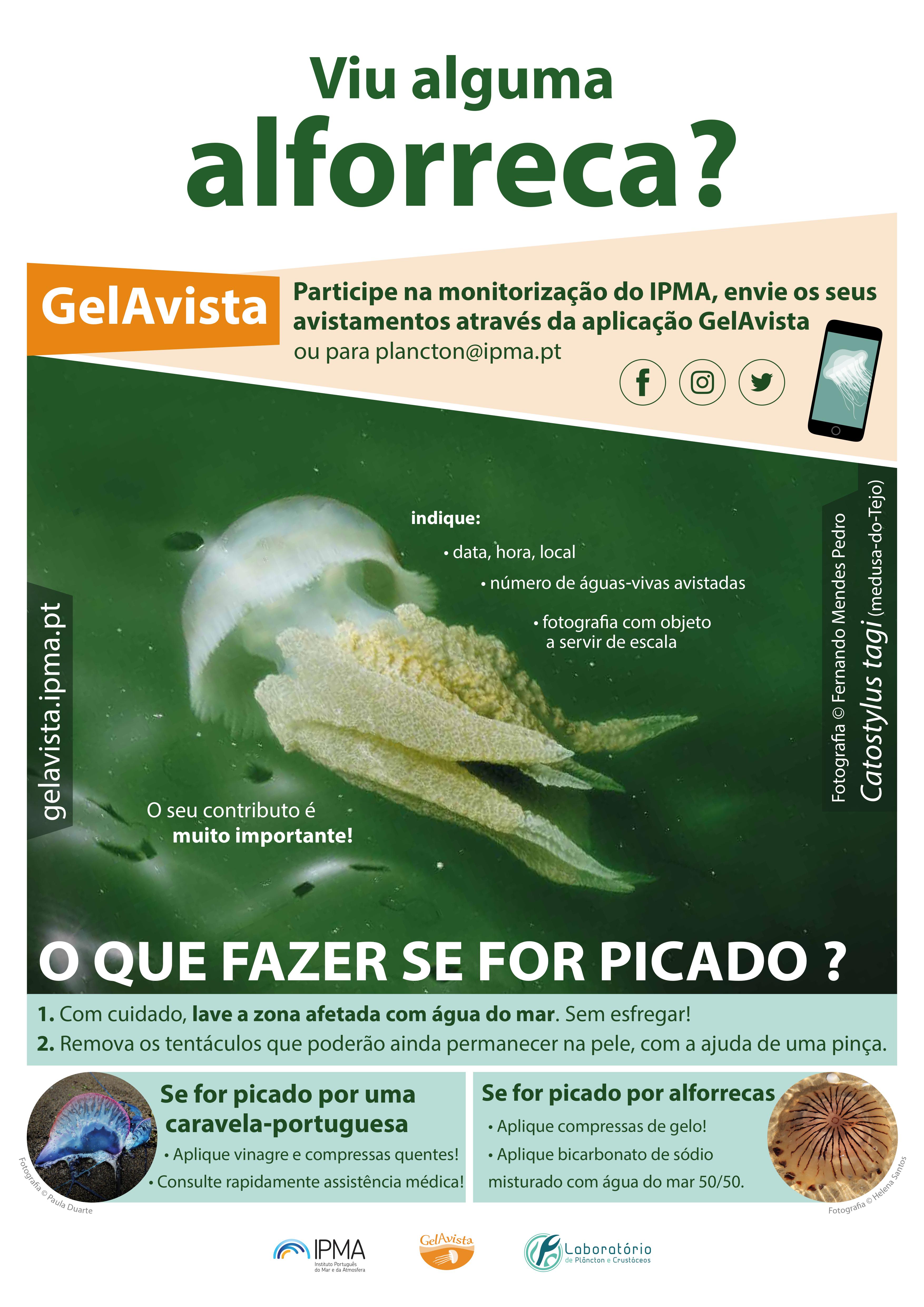 Para o email plancton@ipma.pt, ou através da App GelAvista disponível para sistemas Android na Play Store.